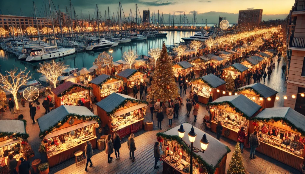 Der Weihnachtsmarkt am Yachthafen von Valencia liegt direkt am Meer und bietet eine atemberaubende Aussicht sowie eine entspannte Atmosphäre. Stöbere nach handgefertigten Geschenken und festlichen Leckereien, während du die festlichen Lichter entlang der Hafenpromenade genießt.